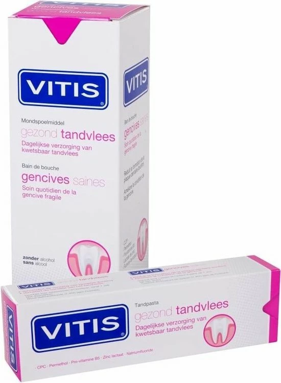 Vitis Gezond Tandvlees mondwater (voorheen Vitis Gingival) is bijzonder geschikt bij gerriteerd of zelfs bloedend tandvlees. Vitis gezond tandvlees mondwater helpt je tandvlees en tanden gezond te houden. Aan Vitis gezond tandvlees is een extra bestanddeel toegevoegd in de vorm van Natriumfluoride en geeft zo extra bescherming tegen caris (gaatjes).
