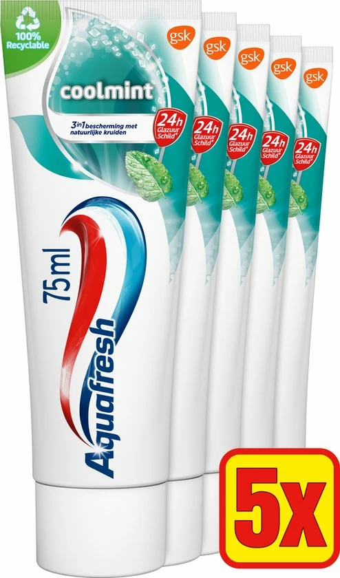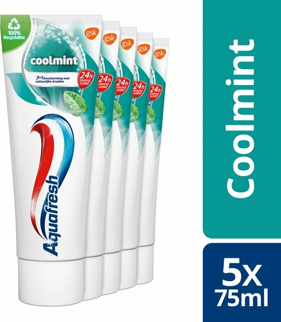 Aquafresh Cool Mint tandpasta met de vertrouwde 3-voudige bescherming tandpasta heeft een frisse smaak op basis van natuurlijke kruiden en Suikerzuur Bescherming*, die dankzij fluoride beschermt tegen suikerzuur in tandplak, de belangrijkste oorzaak van gaatjes. Het helpt vitale mineralen in te sluiten en beschermen. Gaatjes ontstaan als suikers in voeding en drankjes door tandplak worden omgezet in zuren die de tanden verzwakken. Houd je mond gezond met de vertrouwde 3-voudige bescherming van Aquafresh: gezond tandvlees, sterke tanden, frisse adem.