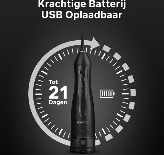 De krachtige ingebouwde 1400 mAh lithium batterij in de waterflosser gaat tot 20 dagen mee op een volle accu. Binnen 4 uur is de waterflosser weer volledig opgeladen. Je kunt de waterflosser opladen via het stopcontact.