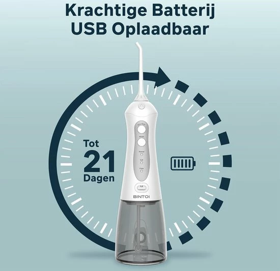 De krachtige ingebouwde 1400 mAh lithium batterij in de waterflosser gaat tot 20 dagen mee op een volle accu. Binnen 4 uur is de waterflosser weer volledig opgeladen. Je kunt de waterflosser opladen via het stopcontact, maar ook in een USB poort. Ben je veel onderweg of op reis, dan kun je de waterflosser bijvoorbeeld in de auto opladen.