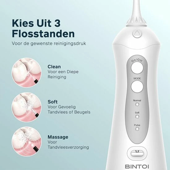 De Bintoi F500 waterflosser zorgt voor diepe reiniging van het gebit. Kies uit drie reinigingsstanden variërend van 30 tot 100 PSI waterdruk en 1400 tot 1800 water pulsen per minuut: