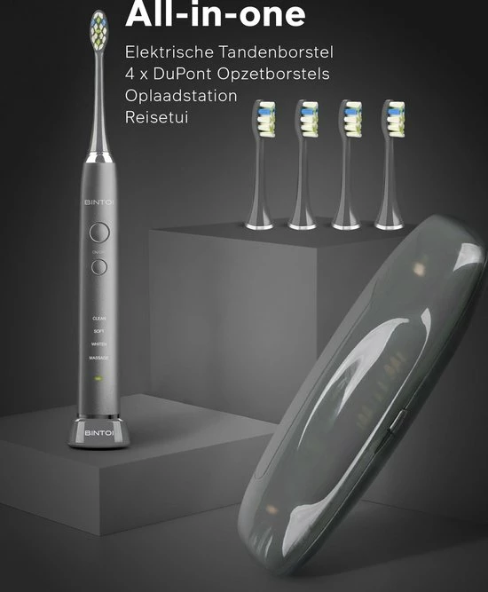 40.000 VPM Slimme tandenborstel – schoonheid, hersens en kracht. De Bintoi iSonic is een moderne elektrische tandenborstel van wereldklasse, boordevol met de modernste technologie. Hij beschikt over een ultra-krachtige en toonaangevende motor die 40.000 trillingen per minuut produceert, een lithium-ion batterij, supersnel draadloos opladen, 4 standen, slimme vibratietimers, 8 door DuPont ontworpen borstelkoppen en borstelharen, en een op maat gemaakte reisetui; dit alles met een slank, lichtgewicht en IPX7 waterproof ontwerp.