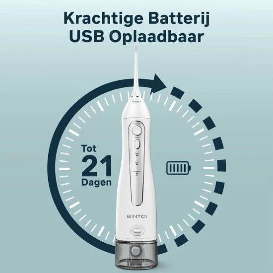 De krachtige ingebouwde 1400 mAh lithium batterij in de waterflosser gaat tot 20 dagen mee op een volle accu. Binnen 4 uur is de waterflosser weer volledig opgeladen.
