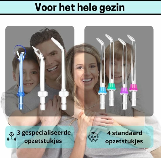 Deze waterflosser wordt geleverd met maarliefst 7 verwisselbare opzetstukjes. U ontvangt 4 normale opzetstukjes. Op deze manier kun je de waterflosser op een hygiënische manier voor het hele gezin gebruiken. Het parodontale opzetstukje zorgt ervoor dat zelfs de kleinste spleetjes in je gebit gereinigd worden. Ook bevat het een orthodontisch opzetstukje, speciaal voor beugels en spalkjes. De tongreiniger zorgt voor een frisse adem.