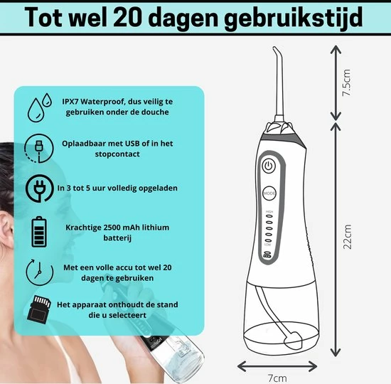 De krachtige pulsen van ons flosapparaat zorgen voor de ultieme massage van het tandvlees. Het stimuleert de doorbloeding en zorgt voor een sterker gebit. De flosser verwijdert 99% van de tandplak en etensresten. Ook wordt de kans op tandvleesinfecties verminderd. Vul het apparaat met mondwater voor een extra frisse adem.