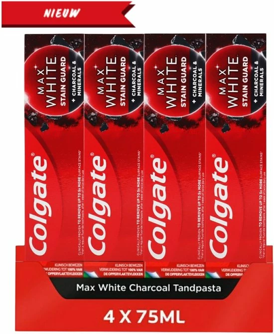 Colgate Max White Charcoal whitening Stain Guard tandpasta bevat actieve houtskool en minerale microdeeltjes welke je tanden reinigen en tot wel 100% van de oppervlakkige vlekken binnen een week verwijderen. De Colgate Max White Charcoal tandpasta zorgt voor natuurlijk witte tanden door de milde abrasieve werking met mineralen. De Colgate Max White Charcoal whitening tandpasta heeft een frisse muntsmaak. De formule is klinisch bewezen en dagelijks gebruik is veilig voor het glazuur. Als enkel een glimlach zoveel vreugde brengt, is het de moeite waard hem te beschermen met Colgate.