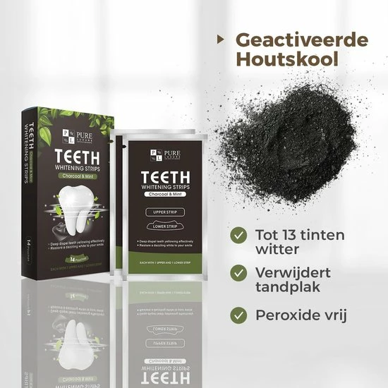 De tanden strips van Pure Luxure zijn niet zomaar standaard zwartkleurige tanden strips, Het bevat houtskool gemaakt uit de hoogste kwaliteit biologische kokosnootschillen. Deze schillen worden onder de juiste omstandigheden verbrand tot een zuiver, dubbel gefilterd houtskoolpoeder van cosmetische kwaliteit. Daarnaast, in tegenstelling tot vele andere merken zit er geen waterstofperoxide in, Hierdoor beschadigen jouw gevoelige tanden niet na de behandeling! Wij geloven namelijk dat een stralend wit gebit absoluut niet ten koste mag gaan van een gezond gebit.