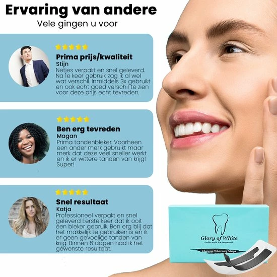 Heeft u last van verkleurde tanden en wilt u weer een stralend wit gebit? Dan zijn de tandenbleek strips van The Glory of White de perfecte oplossing. Binnen enkele eenvoudige stappen zorgen de strips van The Glory of White dat uw tanden weer gaan stralen. U hoeft door deze strips niet meer naar de tandarts voor een tandenbleek behandeling, want het is bewezen dat onze strips een vergelijkbaar resultaat geven. Kies daarom voor de strips van The Glory of White en u bent af van al die dure tandarts rekeningen!