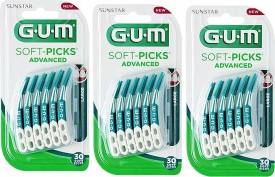 GUM Soft Picks Advanced Large zijn de nieuwste ragers die GUM heeft ontwikkeld. Het stevige handvat zorgt voor extra grip. U verwijderd effectief het tandplak tussen uw tanden en tegelijkertijd masseert en stimuleert u het tandvlees. De zachte rubberen borsteltjes zijn geschikt voor eenmalig gebruik.