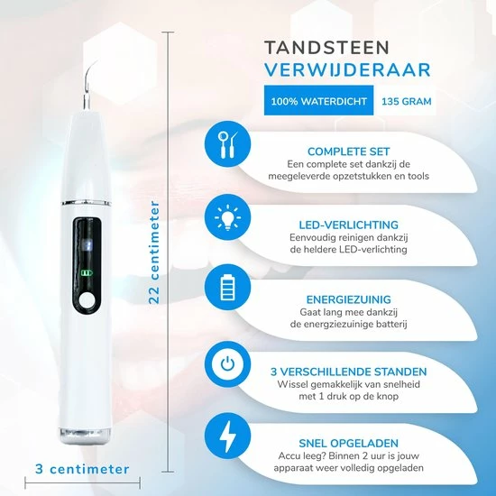 Deze tandsteenverwijderaar helpt je om je tanden en tandvlees de zorg te geven die ze verdienen. Druk op de knop en start gelijk met poetsen. De tandsteenverwijderaar maakt gebruik van dezelfde supersonische triltechniek als de professionele apparatuur van jouw tandarts. Dure en vervelende afspraken bij de tandarts zijn officieel verleden tijd. Want zeg nou eerlijk, waarom zou je naar de tandarts gaan als je jezelf thuis een professionele behandeling kunt geven?