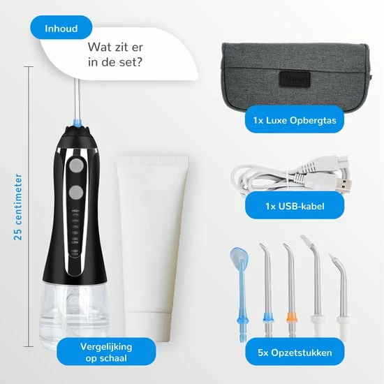 Last van tandplak of zwak tandvlees? Deze elektrische waterflosser houdt je gebit voortaan sterk en gezond. De 5 verschillende waterdruk standen met 1200 pulsen per minuut verwijderen 99,99% van alle voedselresten en tandplak. De ingebouwde 2000mAh batterij is op te laden via een stopcontact of USB-poort en gaat op een volle accu tot wel 20 dagen mee. Kies voor een gezond gebit en ervaar zelf het verschil!