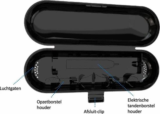In dit etui zijn aan twee kanten beluchtingsgaten gemaakt waardoor dit etui kan ademen en er geen nare geurtjes in blijven hangen. Tevens zorgt dit ervoor dat het vocht uit de borsteltjes kan. Dit etui is geschikt voor alle elektrische tandenborstels kleiner dan 19 cm. Dit maakt hem geschikt voor vrijwel alle modellen waaronder die van Oral-B, Braun en Philips.