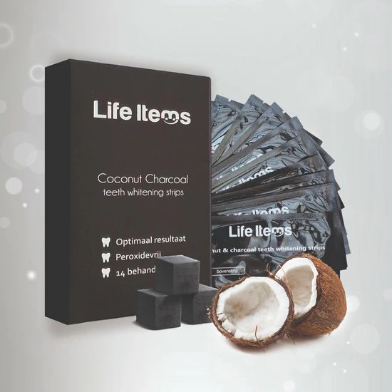 Material strips: kokosolie, kokosvezel, actieve houtskool en 0 % waterstofperoxide