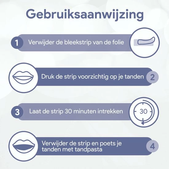 Onze strips bevatten een unieke formule. Ze zijn 100% natuurlijk en peroxide vrij. Dus je hoeft niet bang te zijn voor langdurig tandgevoeligheid. Onze ingredi?nten zijn zodanig samengesteld om het beste resultaat te behalen. In 1 verpakking zitten er 28 strips goed voor 14 behandelingen.