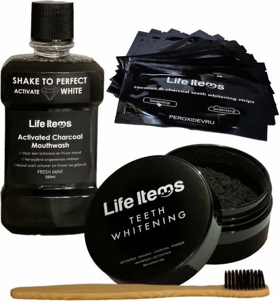 De tandenbleek set van Life Items is voorzien van whitening strips , mondwater ,bamboo tandenborstel en houtskool poeder. Deze zijn zodanig samengesteld om het uiterste uit jouw gebit te halen. De whitening strips en mond poeder hebben een unieke werking, waardoor je na een aantal behandelingen al resultaat ervaart. Samen met de mondwater bieden wij volledige bescherming van de mond. Zo heb je de complete set in huis om het beste resultaat te behalen.