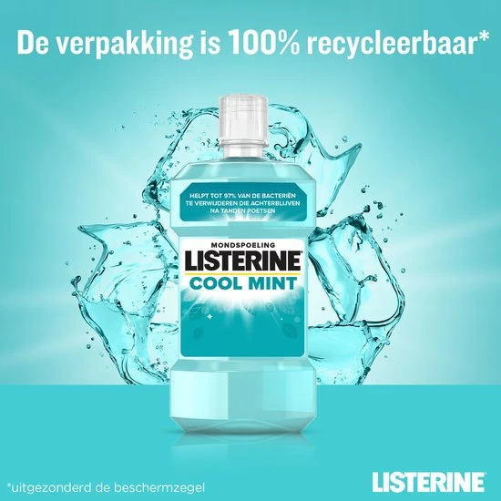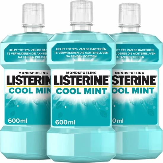 Met een opvallend frisse muntsmaak verzorgt LISTERINE Cool Mint mondwater de tanden en de mond op effectieve wijze. De formule met vier essenti?le oli?n verwijdert tot 97% van de bacteri?n die overblijven na het tandenpoetsen. LISTERINE Cool Mint mondwater vermindert tandplak, een belangrijke oorzaak van gingivitis ofwel tandvleesontsteking. De aangename muntsmaak zorgt voor langdurig frisse adem. Aanbevolen door mondhygi?nisten.
