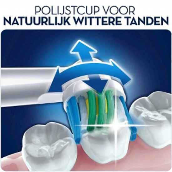 De Oral-B 3D White opzetborstel heeft een speciaal ontworpen polijstcup om verkleuringen op het tandoppervlak te helpen verwijderen terwijl de borstelharen tandplak verwijderen, waardoor hij ideaal is voor nog betere reiniging en wittere tanden.
