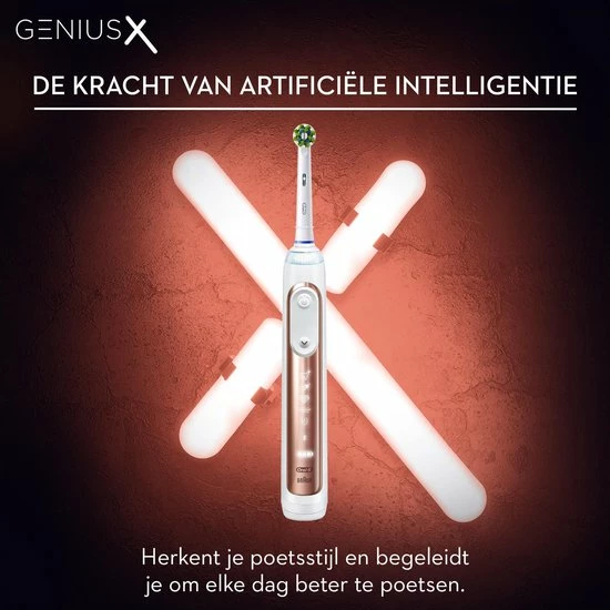De Oral-B Genius X is voorzien van bewegingssensoren en aangedreven door artifici?le intelligentie om uw poetsstijl te herkennen en u elke dag te begeleiden voor de beste resultaten. Het was nog nooit zo gemakkelijk om te poetsen zoals uw tandarts dat aanbeveelt voor een superieure reiniging en gezonder tandvlees. Deze prachtige geavanceerde tandenborstel beschermt uw gevoelige tandvlees en helpt toekomstige problemen voorkomen: de combinatie van de revolutionaire Gum Guard-technologie, 360 SmartRing en poetsdruksensor waarschuwen u, verminderen de snelheid als u te hard poetst en laten u weten wanneer u te lang op een plek poetst voor een zachtere poetsroutine. Ten slotte wordt hij geleverd met een lithium-ion-batterij die meer dan 2 weken meegaat met 1 oplaadbeurt. Met de Oral-B Genius X Speciale Editie kunt u niet verkeerd poetsen. Geen wonder dat Oral-B het meest aanbevolen merk door tandartsen wereldwijd is.