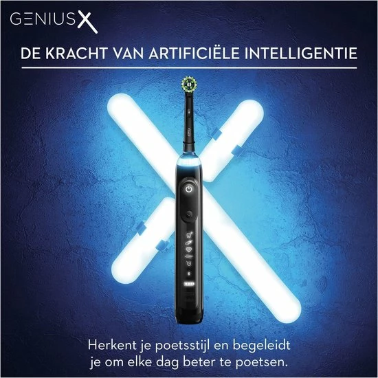 De Oral-B Genius X is voorzien van bewegingssensoren en aangedreven door artifici??le intelligentie om uw poetsstijl te herkennen en u elke dag te begeleiden voor uw beste resultaten. Het was nog nooit zo gemakkelijk om te poetsen zoals uw tandarts dat aanbeveelt voor een superieure reiniging en gezonder tandvlees. Deze prachtige geavanceerde tandenborstel beschermt uw gevoelige tandvlees en helpt toekomstige problemen voorkomen: de combinatie van de revolutionaire Gum Guard-technologie, 360 SmartRing en poetsdruksensor waarschuwen u, verminderen de snelheid als u te hard poetst en laten u weten wanneer u te lang op een plek poetst voor een zachtere poetsroutine. Ten slotte wordt hij geleverd met een lithium-ionbatterij die meer dan 2 weken meegaat met 1 oplaadbeurt. Met de Oral-B Genius X kunt u niet verkeerd poetsen.