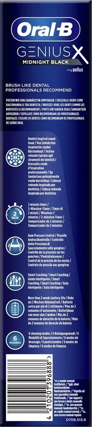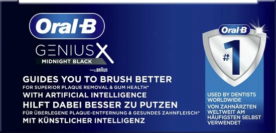 De Oral-B Genius X Speciale Editie is voorzien van bewegingssensoren en aangedreven door artifici?le intelligentie om uw poetsstijl te herkennen en u elke dag te begeleiden voor de beste resultaten. Het was nog nooit zo gemakkelijk om te poetsen zoals uw tandarts dat aanbeveelt voor een superieure reiniging en gezonder tandvlees. Deze prachtige geavanceerde tandenborstel beschermt uw gevoelige tandvlees en helpt toekomstige problemen voorkomen: de combinatie van de revolutionaire Gum Guard-technologie, 360 SmartRing en poetsdruksensor waarschuwen u, verminderen de snelheid als u te hard poetst en laten u weten wanneer u te lang op een plek poetst voor een zachtere poetsroutine. Ten slotte wordt hij geleverd met een lithium-ion-batterij die meer dan 2 weken meegaat met 1 oplaadbeurt. Met de Oral-B Genius X Speciale Editie kunt u niet verkeerd poetsen. Geen wonder dat Oral-B het meest aanbevolen merk door tandartsen wereldwijd is.