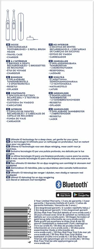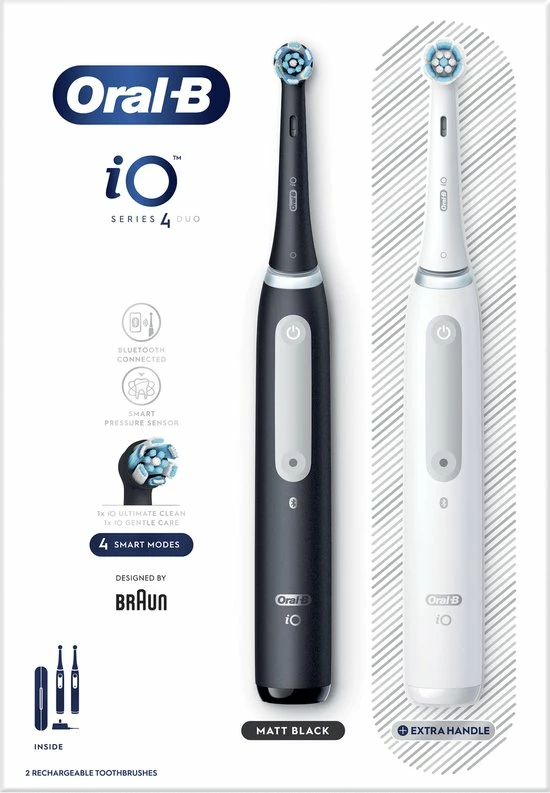 - Inhoud: 2 iO4-handvatten, 2 opzetborstels, 1 reisetui, 1 oplader