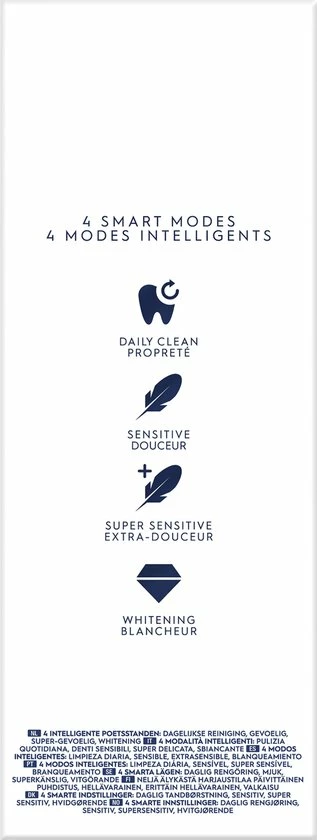 - 4 poetsstanden om uw poetsbeurt te personaliseren: Dagelijkse reiniging, Whitening, Gevoelige tanden, Supergevoelige tanden
