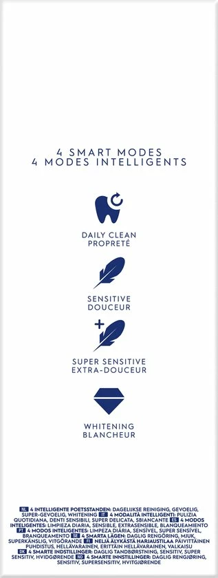 - 4 poetsstanden om uw poetsbeurt te personaliseren: Dagelijkse reiniging, Whitening, Gevoelige tanden, Supergevoelige tanden