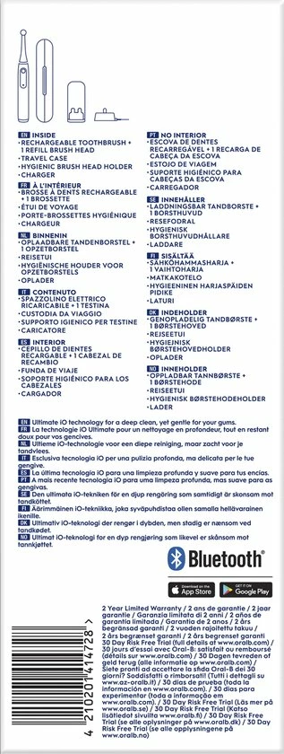 - Inhoud: 1 iO4-handvat, 1 opzetborstel, 1 reisetui, 1 oplader, 1 opzetborstelhouder
