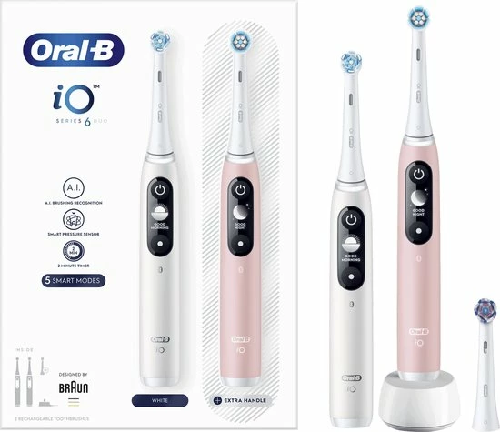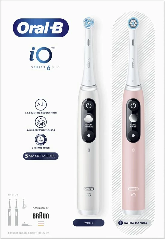 - Bevat: 2 iO6-handvatten met 1 gentle clean borstelkop, 1 ultimate clean borstelkop, 1 radiant white borstelkop, 1 oplader