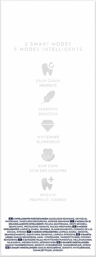 - 5 poetsstanden om uw poetsbeurt te personaliseren: Dagelijkse reiniging, Gevoelige tanden, Tandvleesverzorging, Intense reiniging, Whitening