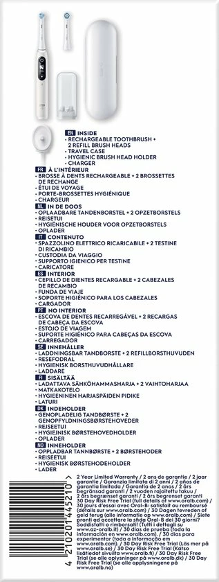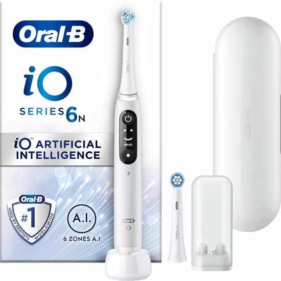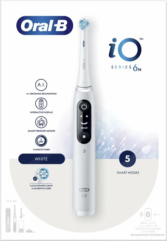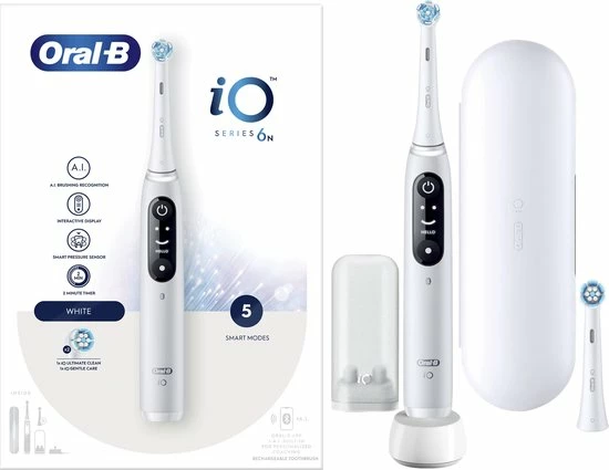 - Inhoud: 1 iO6-handvat met 2 opzetborstels, 1 reisetui, 1 oplader, 1 opzetborstelhouder