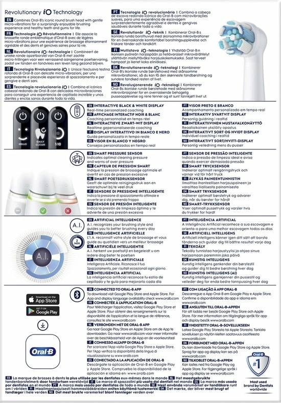 Oral-B heeft zijn uiterste best gedaan om een poetservaring te creëren die alle klassen overtreft. Meer dan alleen een vooruitgang in technologie om techniek van wereldklasse te integreren – voor de meest grondige, zachte en stille reiniging van uw leven. Meer dan design om een echt toestel van verlangen te creëren – met een strakke look voor de meest gewilde technologie. Als u van een manuele naar een elektrische tandenborstel overschakelt, poetst u uiteraard beter. Maar als u van een elektrische tandenborstel naar een iO overschakelt, gaat u van een gewone naar een werkelijk buitengewone ervaring die u op een andere manier ziet, hoort en voelt.