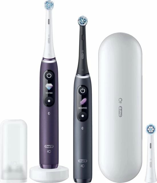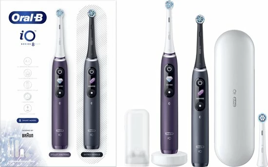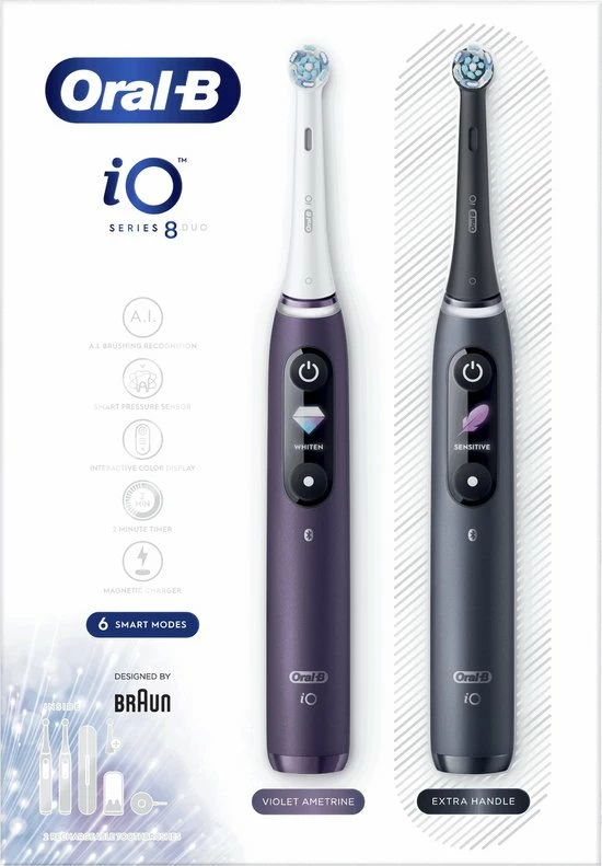 - Bevat: 2 iO8-handvatten met 3 opzetborstels, 1 premium reisetui, 1 oplader, 1 opzetborstelhouder