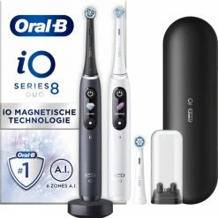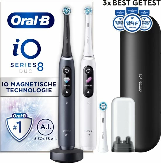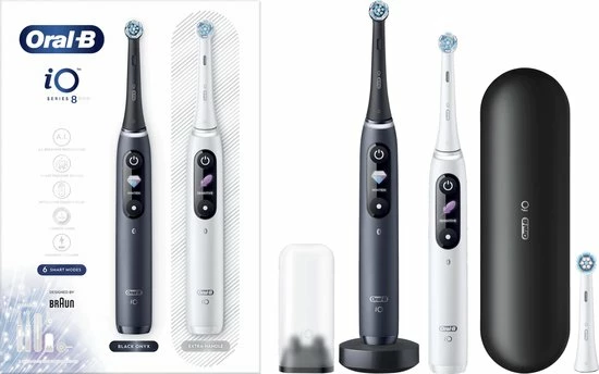 - Bevat: 2 iO8-handvatten met 3 opzetborstels, 1 premium reisetui, 1 oplader, 1 opzetborstelhouder