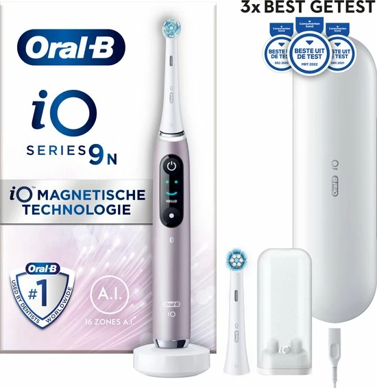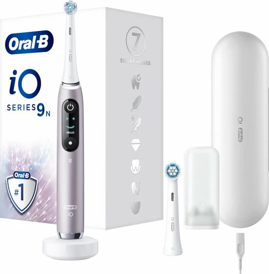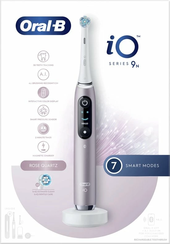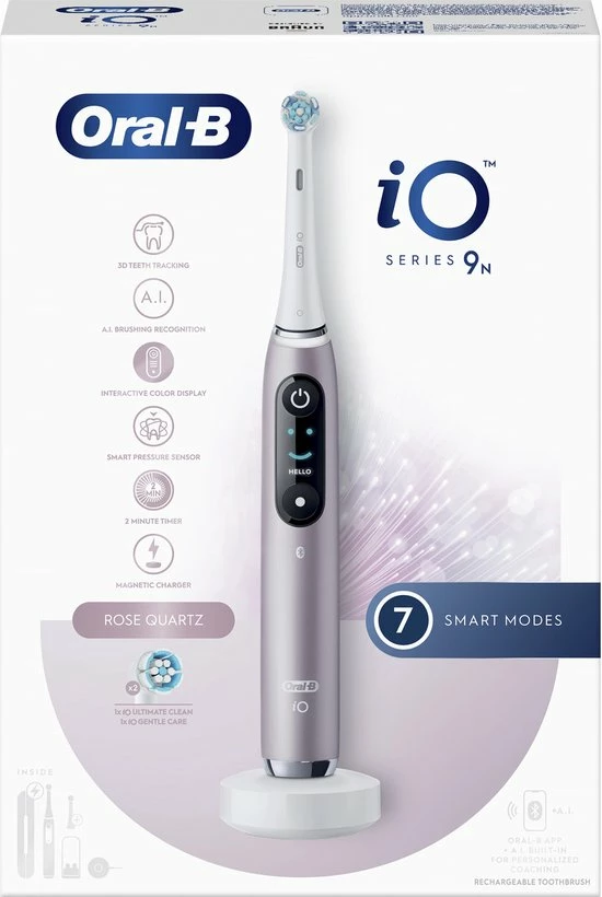 - Inhoud: 1 iO9-handvat met 2 opzetborstels, 1 oplaadreisetui, 1 oplader, 1 opzetborstelhouder