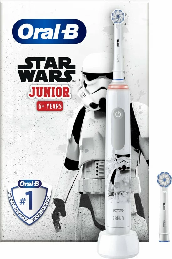De Oral-B Junior Star Wars elektrische tandenborstel voor kinderen vanaf 6 jaar is in samenwerking met tandartsen ontworpen voor een superieure reiniging. Hij heeft een 360? poetsdrukcontrole op het tandvlees die een rood lampje laat knipperen en de poetssnelheid verlaagt als hij detecteert dat er te hard gepoetst wordt. Bovendien heeft de ronde opzetborstel extra zachte borstelharen. Om het poetsen nog leuker te maken, kan hij worden gebruikt met de gratis Disney Magic Timer-app van Oral-B. 90% van de kinderen poetst langer bij gebruik van de app. Dit is d? borstel om kinderen te leren zelfstandig te poetsen en een gezonde poetsgewoonte te ontwikkelen waar ze hun hele leven profijt van hebben.