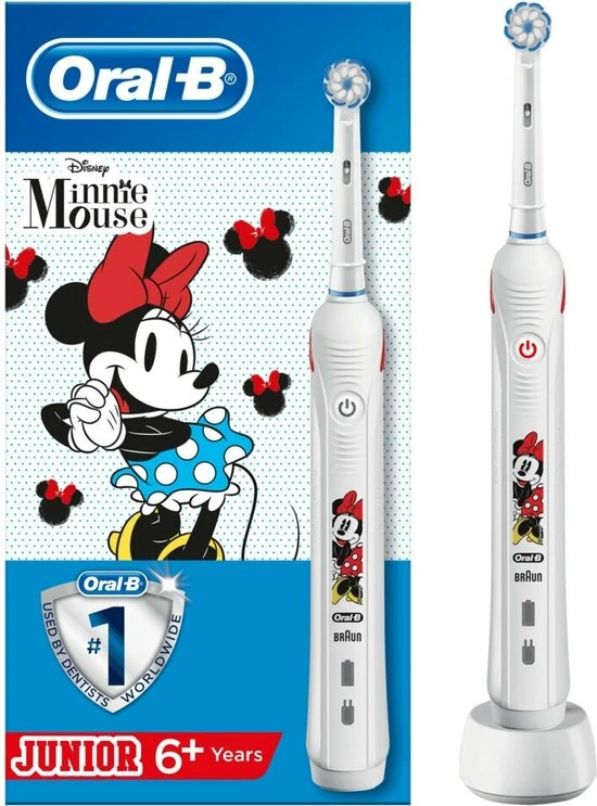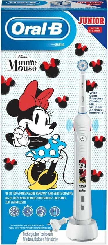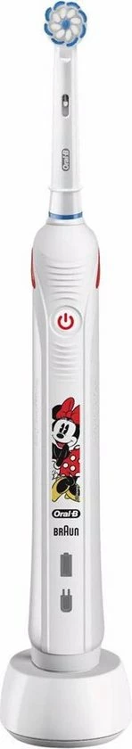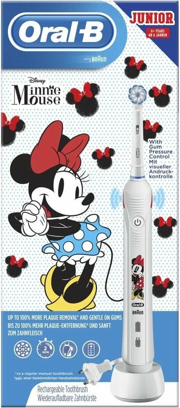 De Oral-B Junior Minnie Elektrische tandenborstel heeft een oplaadbare batterij die tot twee weken meegaat en wordt geleverd met een oplaadstation dat gemakkelijk op elke wastafel past.