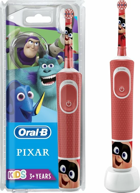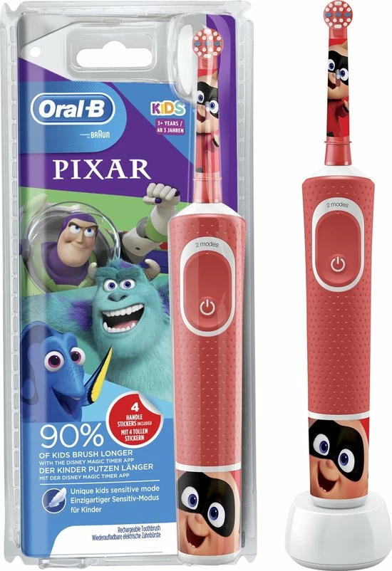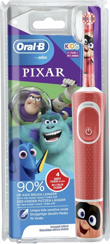 Met de Oral-B Kids elektrische tandenborstel voor kinderen vanaf 3 jaar kunnen kinderen plezier beleven aan Disney Best of Pixar ?n genieten van de milde, effectieve reiniging van een door tandartsen aanbevolen tandenborstel van Oral-B. Met een unieke, kindvriendelijke gevoelige modus reinigt deze borstel de tanden van kinderen voorzichtig. Hij verwijdert meer tandplak dan een gewone manuele tandenborstel. Er zitten vier leuke Disney Best of Pixar-stickers bij om het handvat mooier te maken..