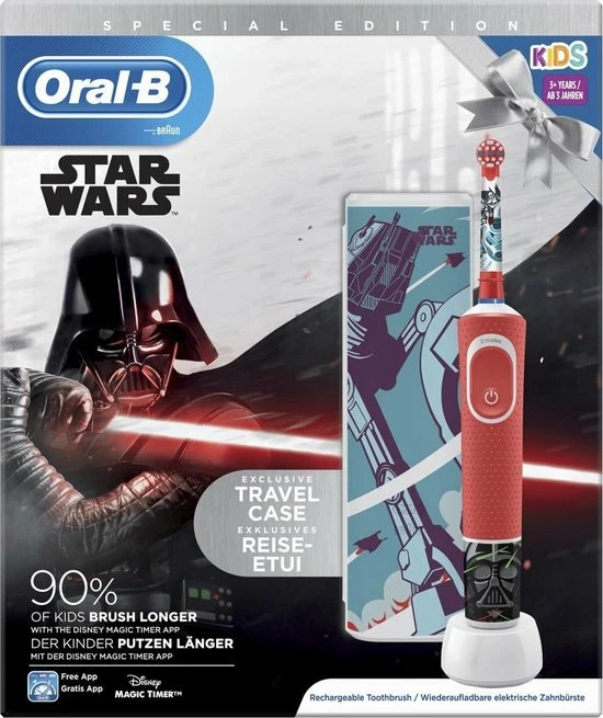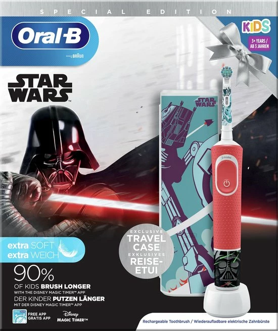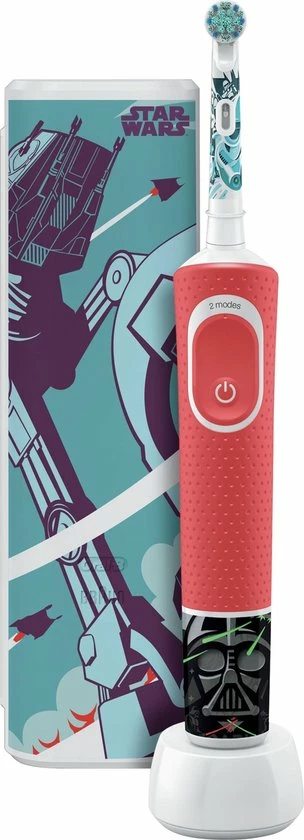 Met de Oral-B Kids elektrische tandenborstel voor kinderen vanaf 3 jaar kunnen kinderen plezier beleven aan Star Wars én profiteren van de milde, effectieve reiniging van een door tandartsen aanbevolen tandenborstel Oral-B. Met 2 poetsstanden, waaronder een unieke kindvriendelijke gevoelige modus reinigt deze borstel de tanden van kinderen voorzichtig. Hij verwijdert meer tandplak dan een gewone manuele tandenborstel. Er zitten vier leuke Star Wars-stickers bij om het handvat mooier te maken..