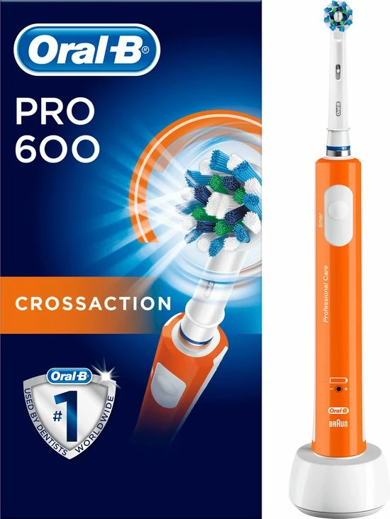 De Oral-B PRO 600 elektrische tandenborstel biedt een superieure reiniging vs. een gewone manuele tandenborstel. Het op professionele reinigingsinstrumenten ge?nspireerde ontwerp van de CrossAction tandenborstelkop omvat elke tand met borstelharen die in een hoek van 16 graden zijn geplaatst en de 3D-reinigingsactie trilt, roteert en pulseert om zo tot 100% meer tandplak los te maken en te verwijderen dan een gewone manuele tandenborstel. De timer in het handvat helpt je de 2 minuten te poetsen zoals door tandartsen wordt aanbevolen. Bovendien wordt hij aangeboden door Oral-B, het merk dat het meest door tandartsen wereldwijd wordt gebruikt.