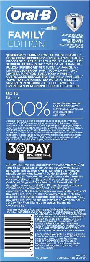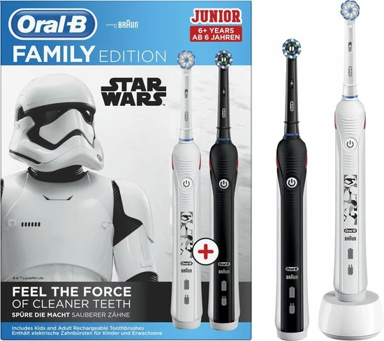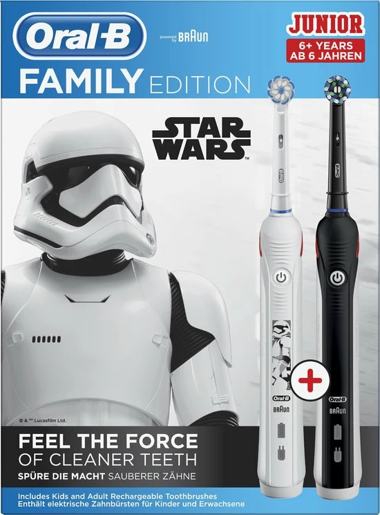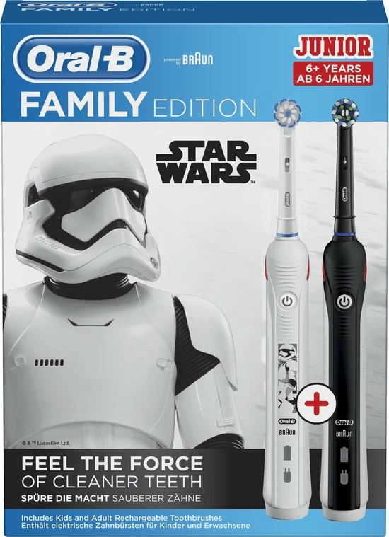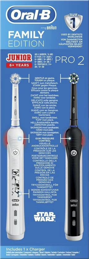 Het Oral-B Gezinseditiepakket is een combinatie van tandenborstels voor het hele gezin. Ervaar de Oral-B Pro 2 van het nummer ??n aanbevolen merk door tandartsen wereldwijd. Het helpt u 2 minuten poetsen met de professionele timer en meldt u om de 30 seconden dat u een ander gebied moet poetsen. U beweegt de borstel gewoon in uw mond en de unieke, ronde kop van Oral-B doet de rest. Hij verwijdert tot 100% meer plak dan een gewone manuele tandenborstel voor gezonder tandvlees en maakt uw glimlach witter vanaf de eerste poetsdag door oppervlaktevlekken te verwijderen. Dat is niet alles, de tandenborstel helpt u ook uw gevoelige tandvlees te beschermen met de poetsdruksensortechnologie die de poetssnelheid vermindert en u waarschuwt als u te hard poetst. De Oral-B Pro 2 tandenborstel is onmisbaar voor iedereen die naar een elektrische tandenborstel wil overschakelen en zijn mondgezondheid wil verbeteren. De Oral-B Junior Star Wars elektrische tandenborstel voor kinderen vanaf 6 jaar is ontworpen in samenwerking met tandartsen voor superieure reiniging om het gevoelige tandvlees van kinderen te beschermen. Hij heeft een druksensor voor het tandvlees die een rood lampje laat knipperen en de poetssnelheid verlaagt als hij detecteert dat er te hard gepoetst wordt. Bovendien heeft de ronde opzetborstel extra zachte borstelharen. Om het poetsen nog leuker te maken, kan hij worden gebruikt met de gratis Disney Magic Timer-app van Oral-B. 90% van de kinderen poetst langer bij gebruik van de app. Dit is d? borstel om kinderen te leren zelfstandig te poetsen en een gezonde poetsgewoonte te ontwikkelen waar ze hun hele leven profijt van hebben.