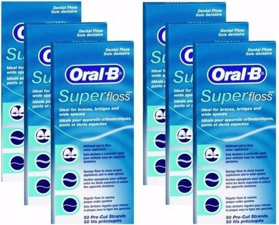 Oral-B® Super Floss® is ideaal voor het reinigen van beugels, bruggen en grote ruimten tussen tanden. De drie unieke bestanddelen – een flosrijger met een stijf uiteinde, sponsachtige flosdraad en gewone flosdraad – werken samen voor de beste resultaten.