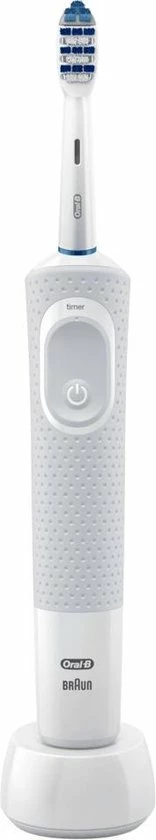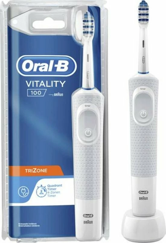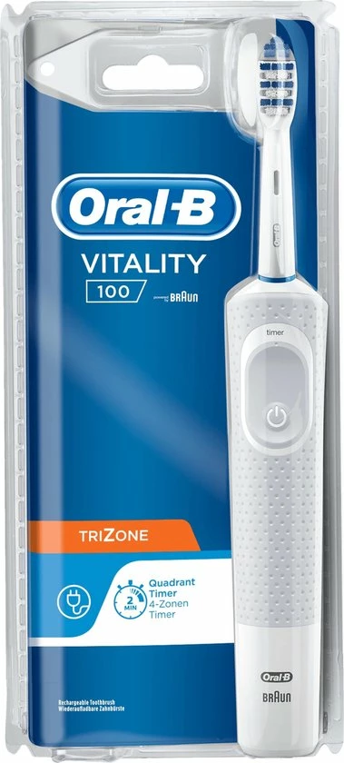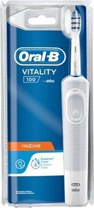 De Oral-B Elektrische Tandenborstel Vitality 100 Trizone bevat 7600 bewegingen per minuut en zorgt voor een effectieve reiniging ten opzichte van een manuele tandenborstel. De trizone opzetborstell heeft een geavanceerde driezone reinigingstechnologie. De dynamische top voor de moeilijk te bereiken achterkant van de tanden. Kortere, stilstaande borstelharen voor grondige reiniging van tandoppervlaktes en langere, bewegende borstelharen voor reiniging diep tussen de tanden.De tandenborstel bevat een fijne grip, waardoor de tandenborstel minder snel glad wordt en uit de hand kan vallen. De geïntegreerde timer op het handvat geeft elke 30 seconden een seintje en helpt om 2 minuten te poetsen.