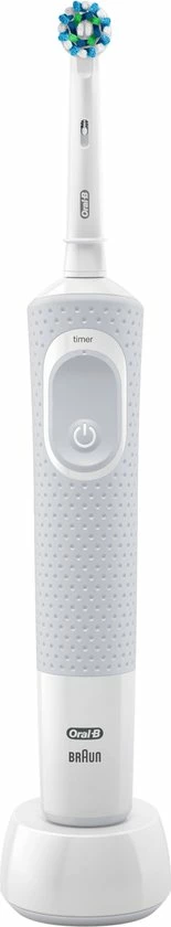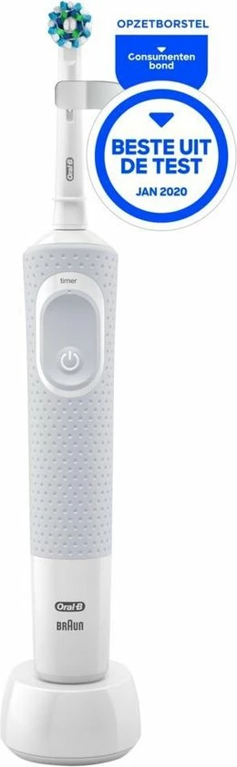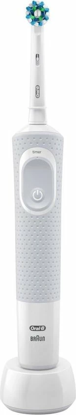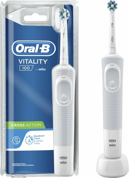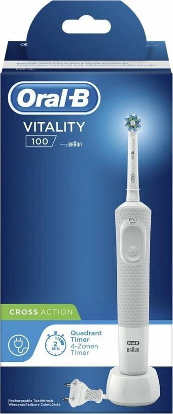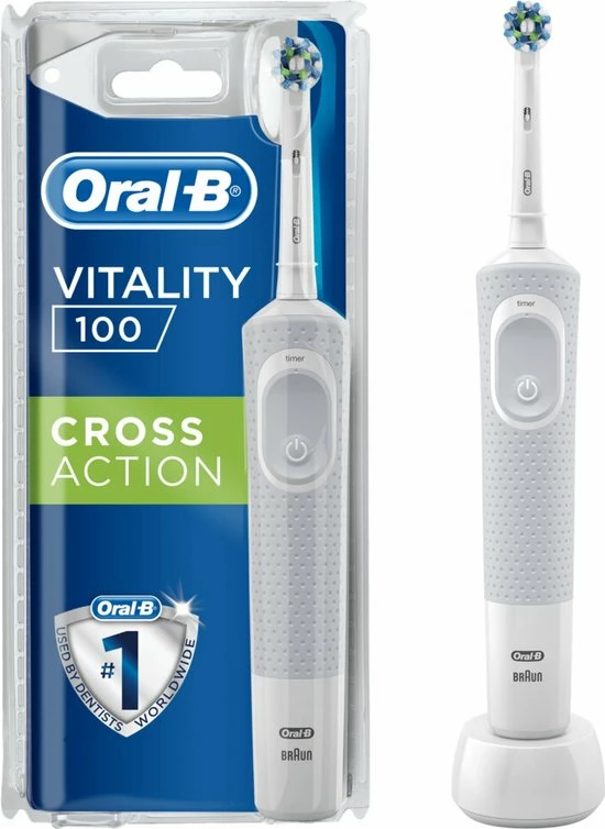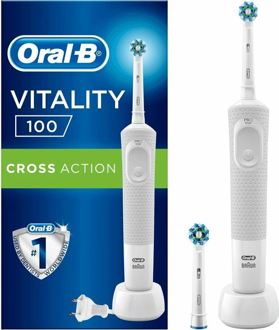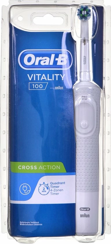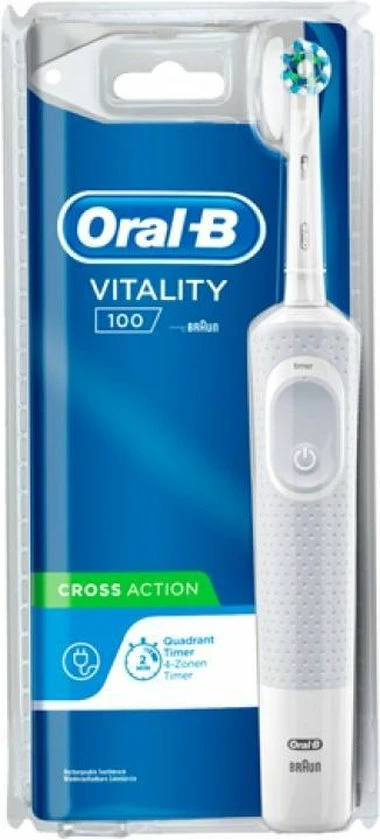 De Oral-B Vitality 100 CrossAction elektrische tandenborstel biedt een klinisch bewezen superieure reiniging in vergelijking met een gewone manuele tandenborstel. De CrossAction borstelkop omhult elke tand met borstelharen die in een hoek van 16 graden zijn geplaatst en de 2D-reinigingsactie oscilleert en roteert om zo meer tandplak te verwijderen dan een gewone manuele tandenborstel. De ge?ntegreerde timer op het handvat helpt u 2 minuten te poetsen zoals door tandartsen wordt aangeraden. Bovendien wordt deze elektrische tandenborstel aangeboden door Oral-B, het merk dat het meest door tandartsen wereldwijd wordt gebruikt. Past op de volgende vervangende opzetborstels: Cross Action, 3D White, Sensi Ultrathin, Sensitive Clean, Precision Clean, Floss Action, Tri Zone, Dual Clean, Power Tip, Ortho Care.