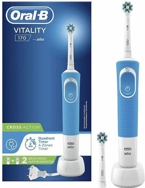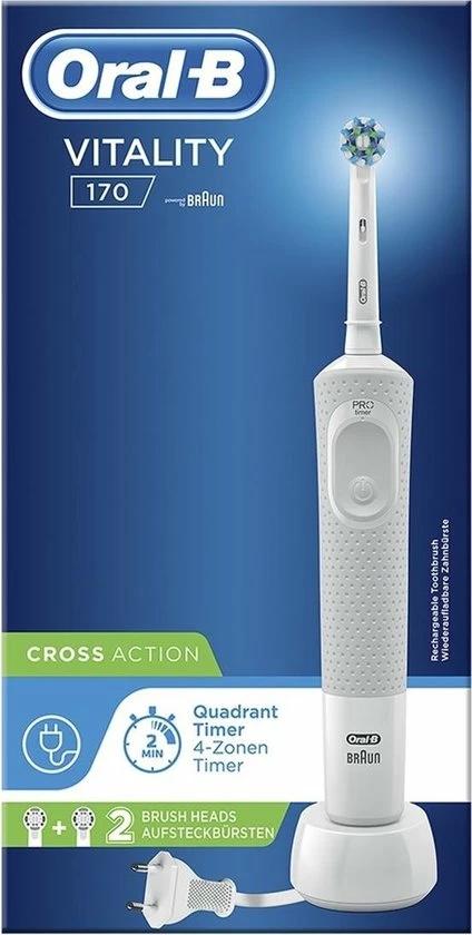 De Oral-B Vitality 170 CrossAction elektrische tandenborstel biedt een klinisch bewezen superieure reiniging in vergelijking met een gewone manuele tandenborstel. De CrossAction borstelkop omhult elke tand met borstelharen die in een hoek van 16 graden zijn geplaatst en de 2D-reinigingsactie oscilleert en roteert om zo meer tandplak te verwijderen dan een gewone manuele tandenborstel.