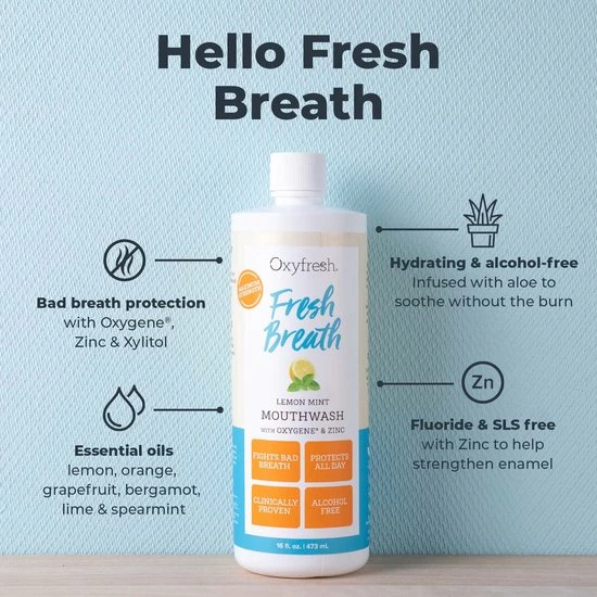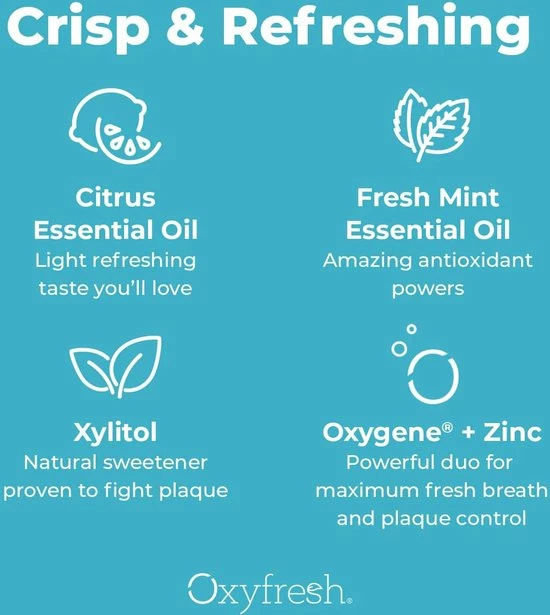 De gepatenteerde en speekselstimulerende formule van Oxyfresh mondwater bestaat uit een unieke combinatie van Oxygene? en zink, dat slechte ademgassen volledig neutraliseert en tegelijkertijd de bacteri?n uitschakelt die verantwoordelijk zijn voor cari?s, tandvleesproblemen, tandsteen en aanslag op de tong.