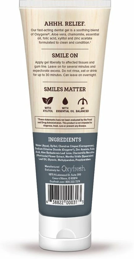 Wondjes en ontstoken tandvlees trekken veel bacteri?n aan die stinkende zwavelgassen produceren die giftig zijn en het tandvlees verder infecteren. Door deze schadelijke bacteri?n te confronteren met Oxygene, worden de sulfide verbindingen geneutraliseerd en omgezet in een frisse adem! Oxyfresh Dental Relief Gel neutraliseert stinkende geuren die bacteri?n uitstoten vanuit de ontstoken weefsels. Tegelijkertijd is deze gel hydraterend, verzachtend en genezend voor mensen die last ondervinden van orale ongemakken zoals ontstoken tandvlees, xerostomie, wondjes en aften.