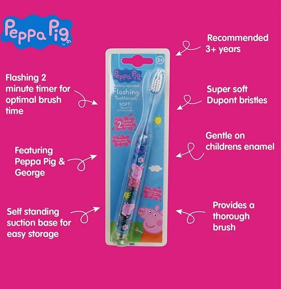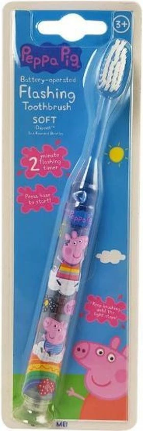 Deze knipperende kindertandenborstel is perfect voor elke fan! Deze handtandenborstel heeft knipperende lampjes op een timer van 2 minuten, de aanbevolen tijd om je tanden te poetsen. De leuke lampjes en het design stimuleren kinderen om hun tanden te poetsen en langer te poetsen. Schakel de knipperlichten in door op het kleine knopje aan de onderkant van de tandenborstel te drukken en wordt geleverd met de meegeleverde batterijen. Het is aan te raden om je tandenborstel elke 3 maanden te vervangen. Ideaal om te gebruiken met Peppa Pig Tandpasta.