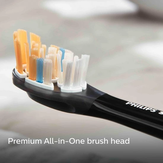 Poets zonder compromissen met de A3 Premium alles-in-??n opzetborstel ? onze beste borstel ooit. De borstelharen staan in een specifieke hoek en verwijderen zo tot wel 20x meer tandplak, zelfs op moeilijk bereikbare plekken*. Driehoekige uiteinden verwijderen tot 100% meer vlekken in minder dan twee dagen*** en de langere borstelharen zorgen voor een grondige reiniging van jouw tandvlees, dat tot 15x gezonder wordt in slechts twee weken**. Een complete verzorging zonder van opzetborstel te hoeven veranderen. Wist je dat opzetborstels minder effectief worden na 3 maanden gebruik? Onze BrushSync?-functie kan je eraan herinneren wanneer het bijna tijd is om ze te vervangen.