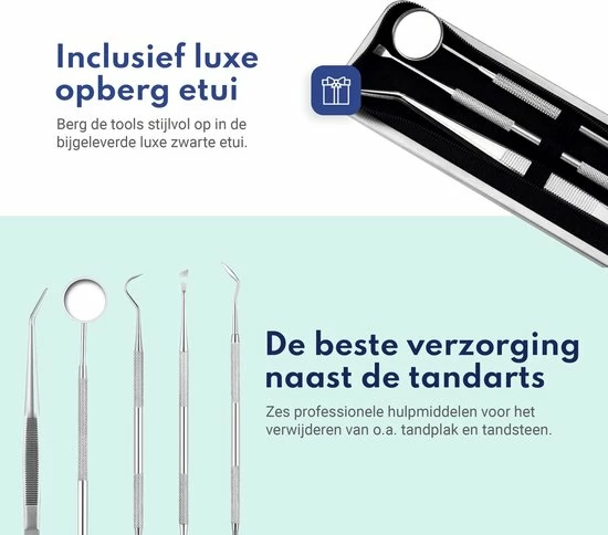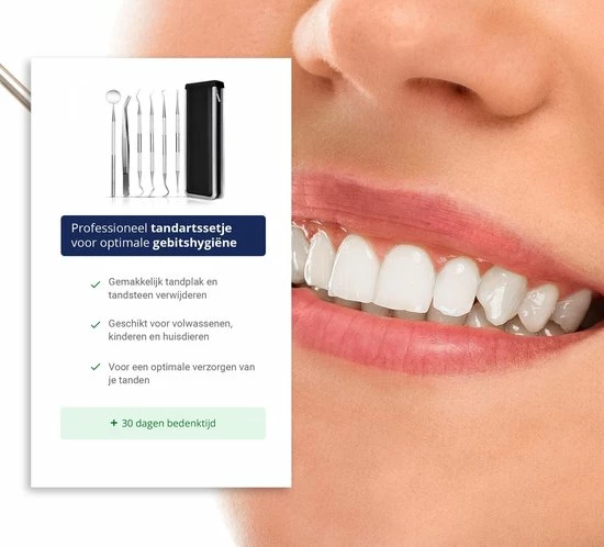 Tandsteen en tandplak verwijderen zijn de meest voorkomende ingrepen als het gaat om een tandartsbezoek. Dit kun je met poetsen en flossen helaas niet weghalen. In deze set zitten o.a. een tandsteen haakje en een tandsteen schraper. Met deze instrumenten haal je het gemakkelijk zelf weg. En dat scheelt je in de kosten bij je eerstvolgende tandartsbezoek.